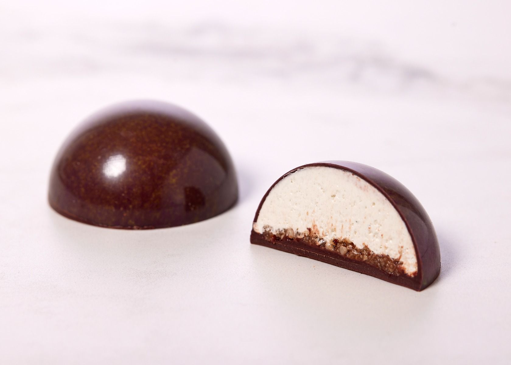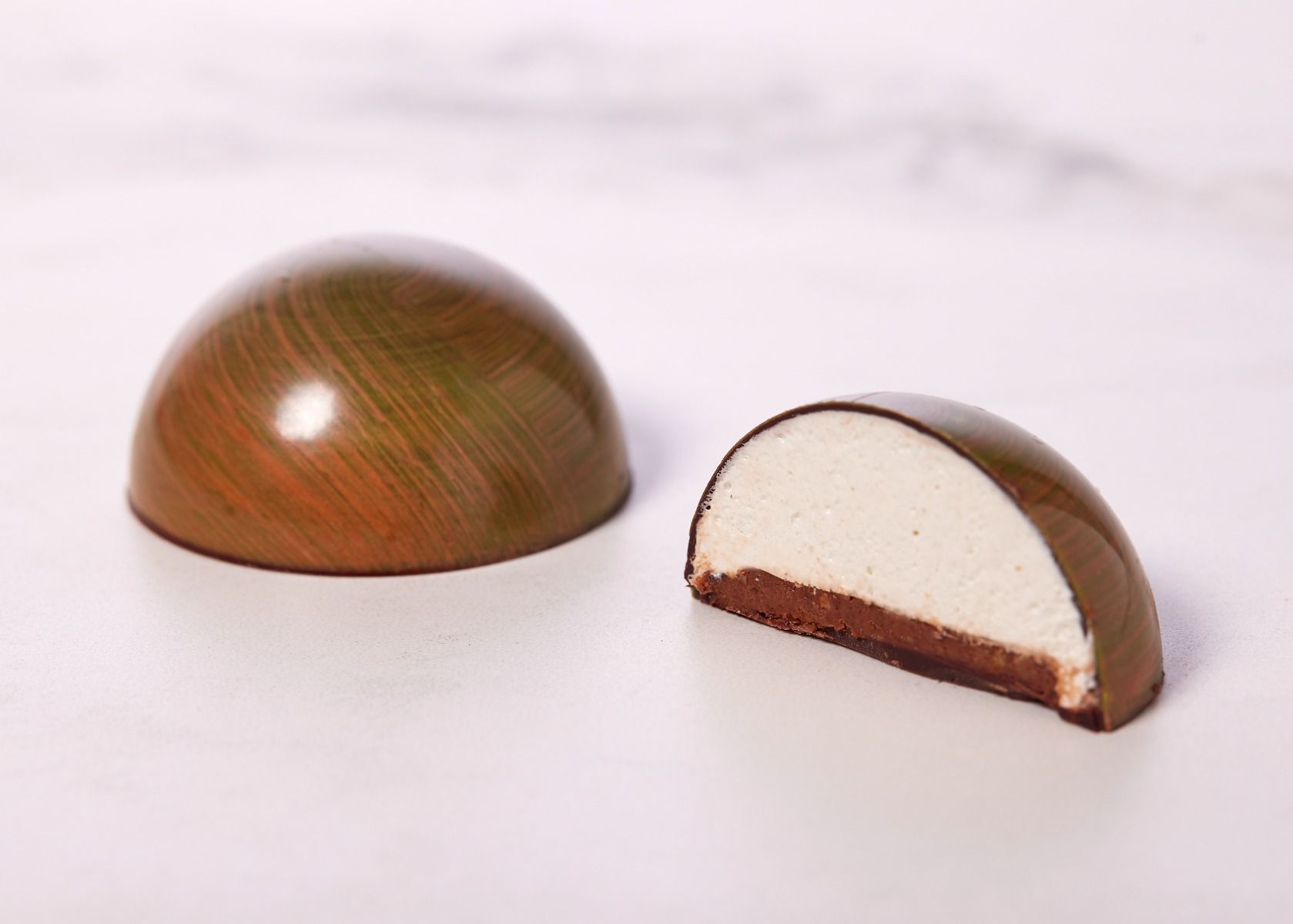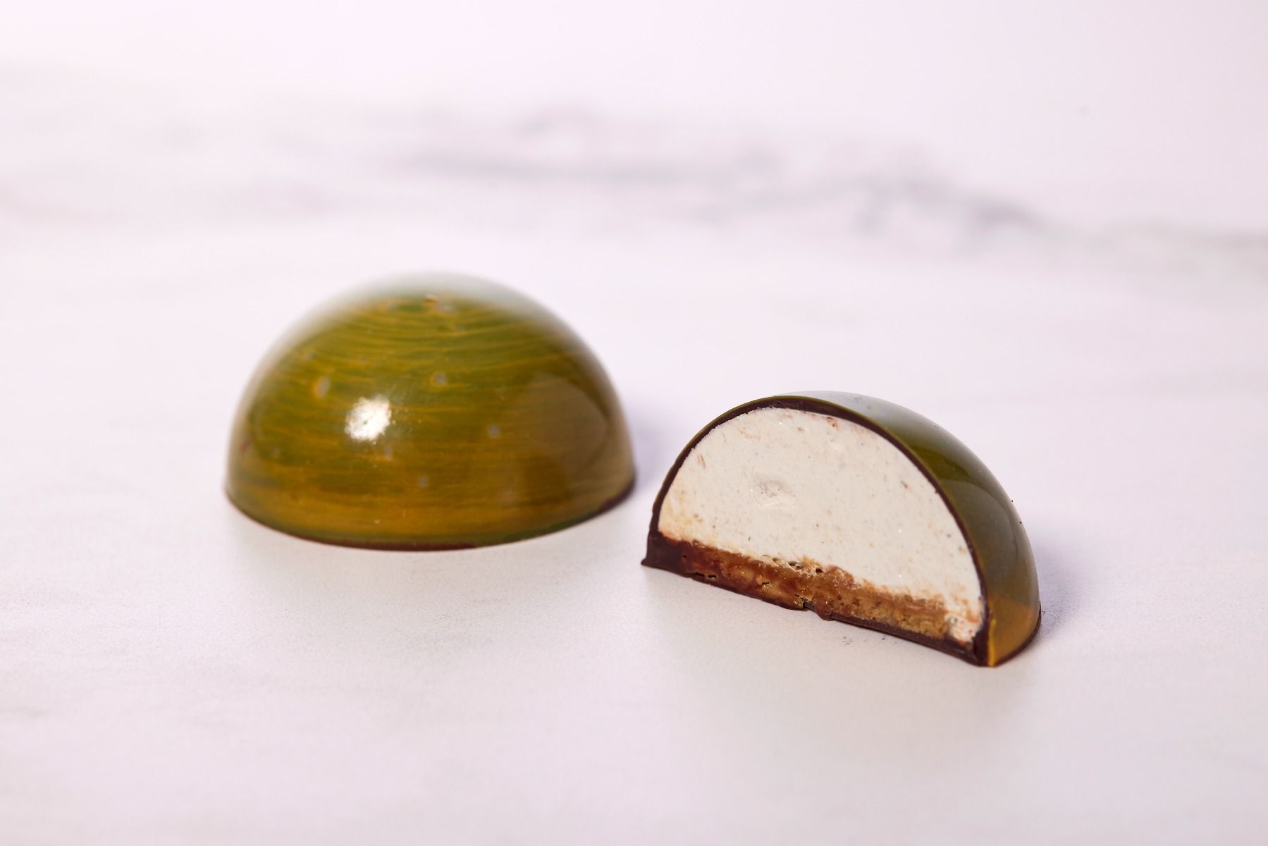 - Skovmærke skum som har en smag, der leder tankerne hen på tonkabønne, og en bund af karamelliserede pistacienødder, støbt i mørk chokolade af typen Original Beans Beni Wild Harvest 66%
