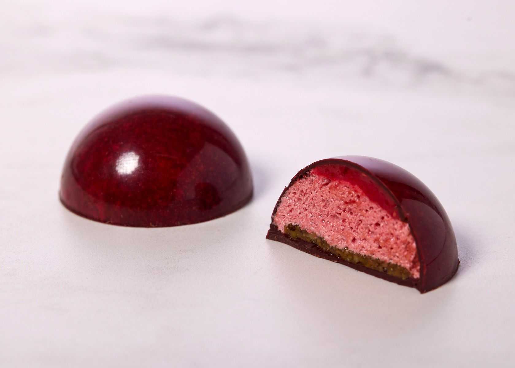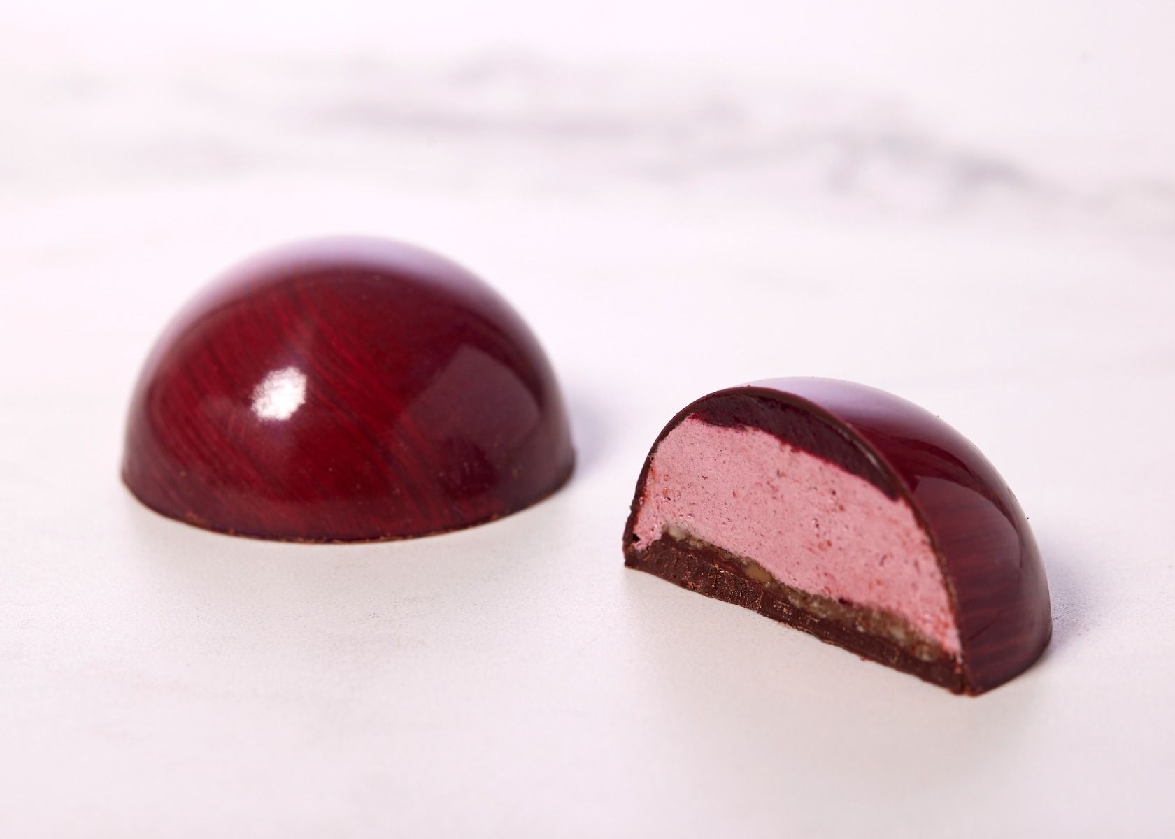 - Hindbær skum en god frisk note af frisk plukket hindbær, med en paté de fruit i toppen, som giver et ekstra skud hindbær-power. omsluttet af Original Beans Piura Porcelana 75% Mørk Chokolade og til sidst på en bund af vores bløde pistaciemarcipan