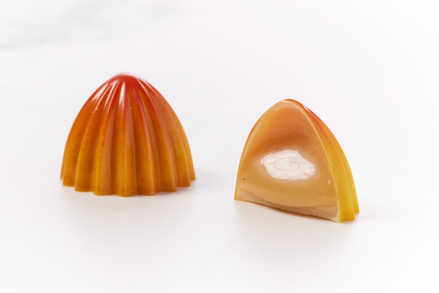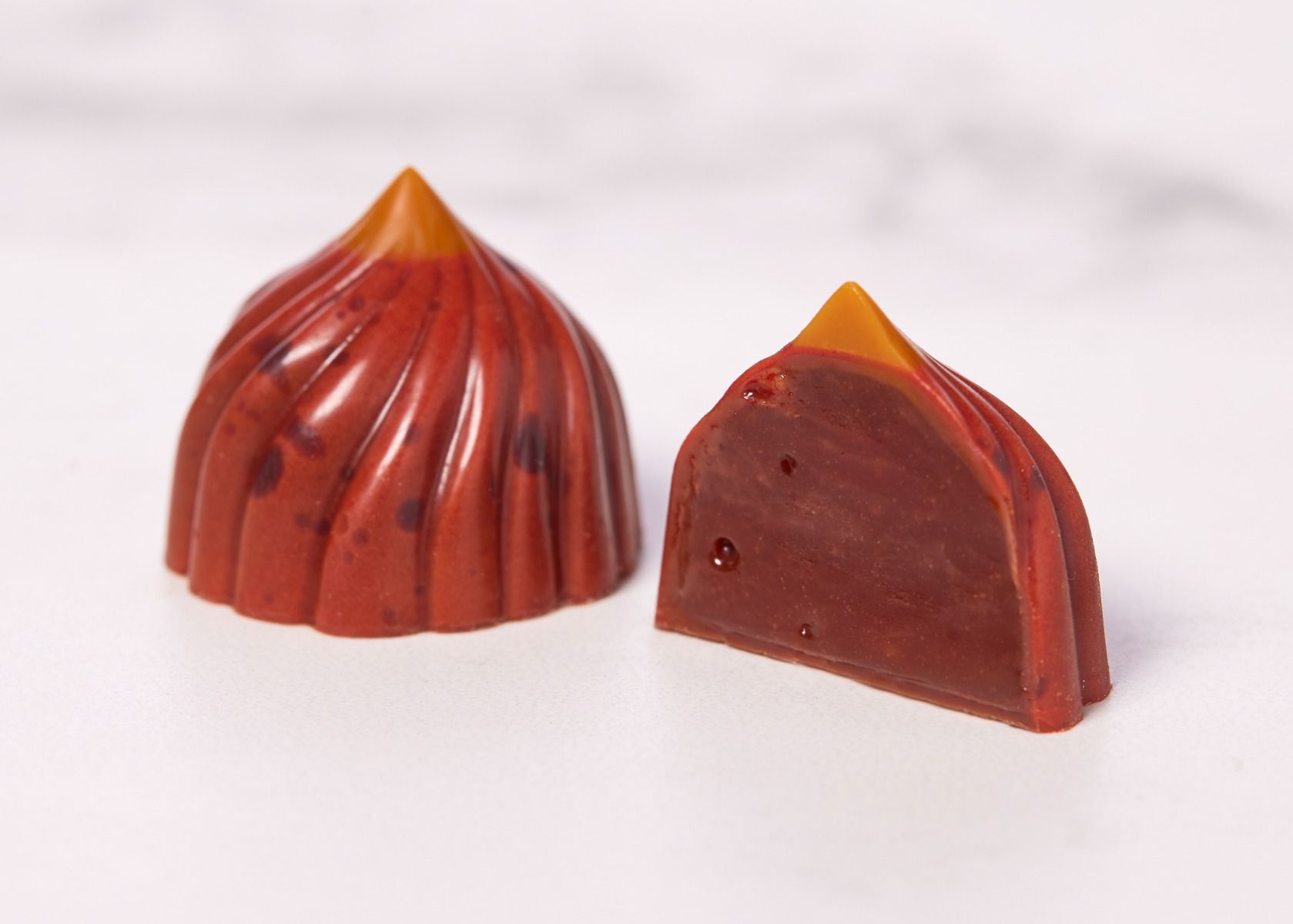 - Appelsinkaramel: Forkæl dig selv med en fyldt chokolade lavet af Esmeralda 42% mælkechokolade, der indeholder en intens og blød appelsinkaramel. Den friske citrusaroma harmonerer perfekt med den cremede chokolade for en lækker og forfriskende smagsoplevelse.