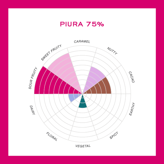 Kakaobønnen, som anvendes til denne chokolade, stammer fra en sjælden hvid kakaobønne, der befinder sig i det nordlige Perus Piura Dal.